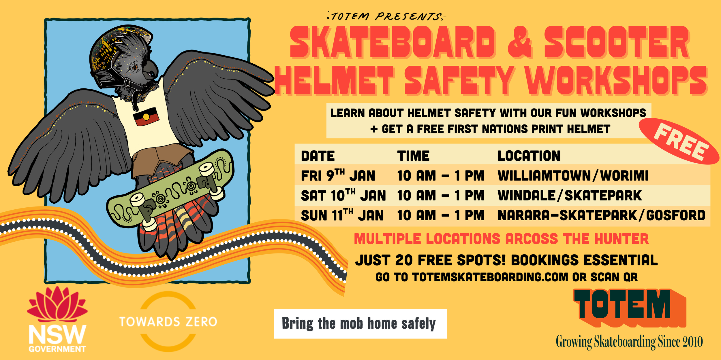 Come along to Narara Skate Park - Gosford and join the Totem Skateboarding team to learn about helmet safety with a FREE 3-hour workshop thanks to Transport for NSW.