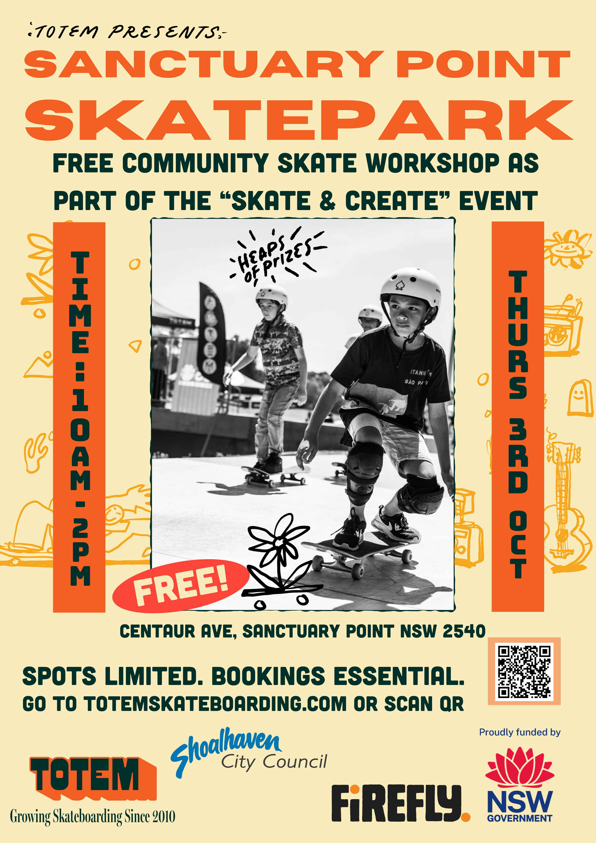 Come along to the Sanctuary Point Skatepark for FREE Community Skate Workshops & JAM!