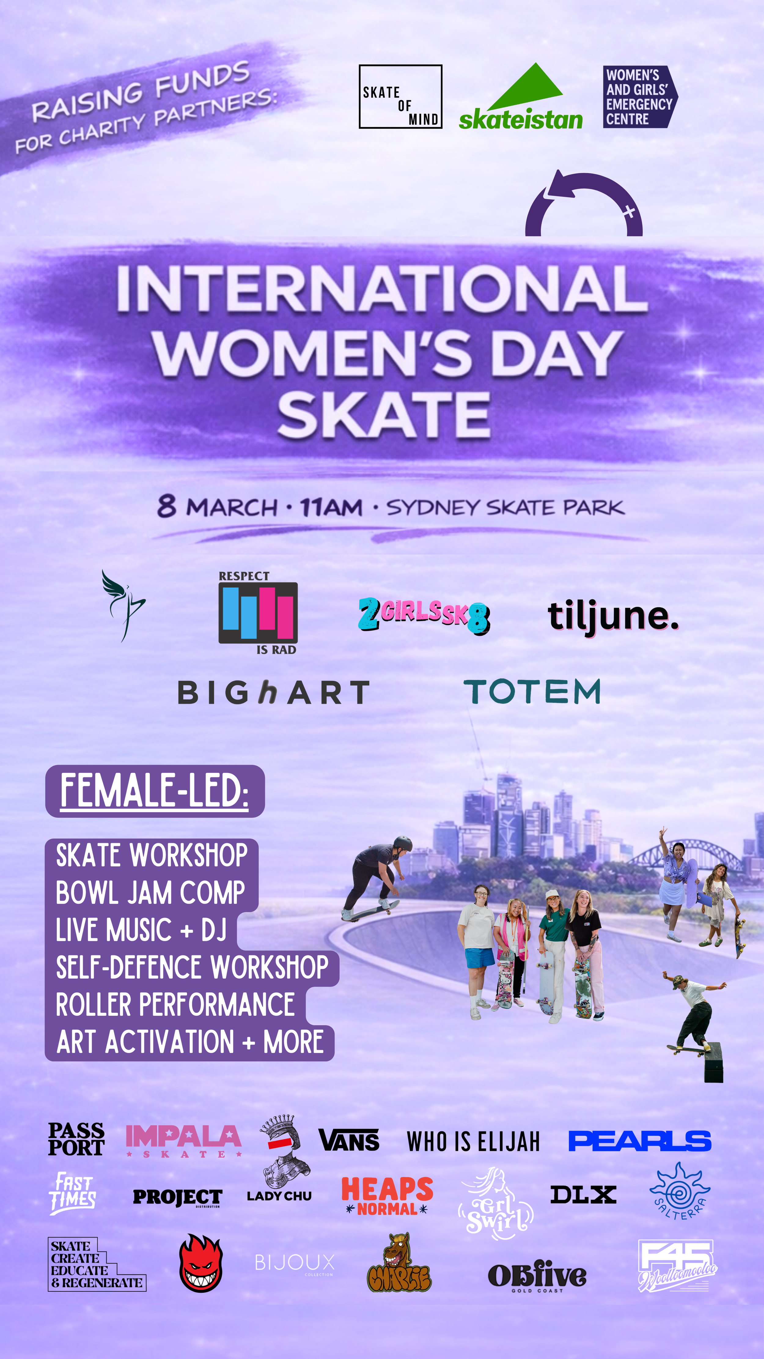 This event is also a fundraiser supporting women-focused skate and mental health initiatives, including BighART's Skate of Mind project and Skateistan, an international organisation using skateboarding as a tool for youth empowerment and education.